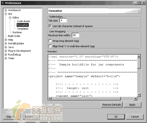 選擇"window→preferences→ant→editor"能夠允許你配置build文件編輯器(設置制表位寬度,邊界區域,高亮,等等)。