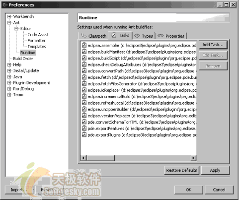 你可以通過使用"window→preferences→ant→runtime"中的"ant preferences"頁面來把新的ant任務和類型添加到eclipse中。這些任務和類型可以在將來用于build文件而不必使用taskdef或typedef任務(它們在通常情況下是需要的)。