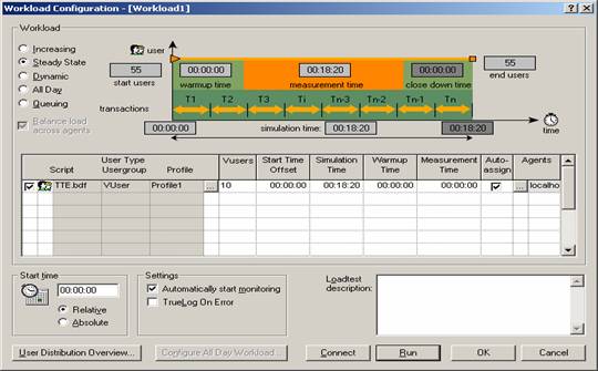 由于例子程序在運行中并沒有很大的壓力,通過控制臺能看到系統(tǒng)的負載情況,為了模擬出和生產(chǎn)系統(tǒng)中相同的運行情況,這里借助于segue公司的silkperformer來對weblogic的例子程序進行加壓(silkperformer也能監(jiān)控到系統(tǒng)的各項性能指標,這里把采集的數(shù)據(jù)與wily進行大概的比較),通過在不同負載下收集到的性能數(shù)據(jù),來分析系統(tǒng)中可能存在的性能問題。