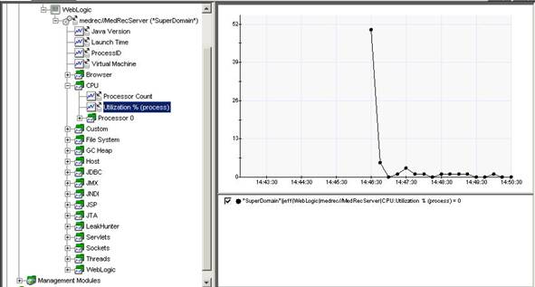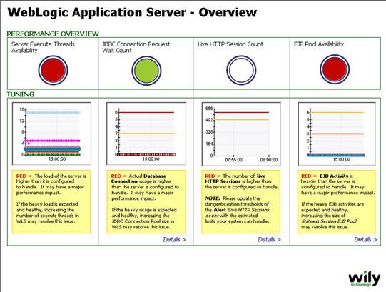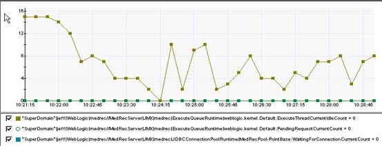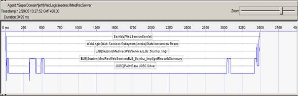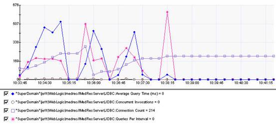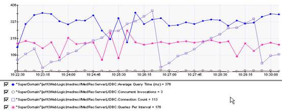 wily有專門針對weblogic的性能監(jiān)控模板,為powerpack,有效監(jiān)控最為關(guān)鍵的weblogic資源,包括線程池,jdbc連接池等,并且第一個實現(xiàn)了對portal(bea portal,ibm portal等)的性能管理和監(jiān)控。通過powerpack可以看到部署在weblogic上的應用的各種性能指標,以weblogic自帶的medical records例子來說,如下圖: