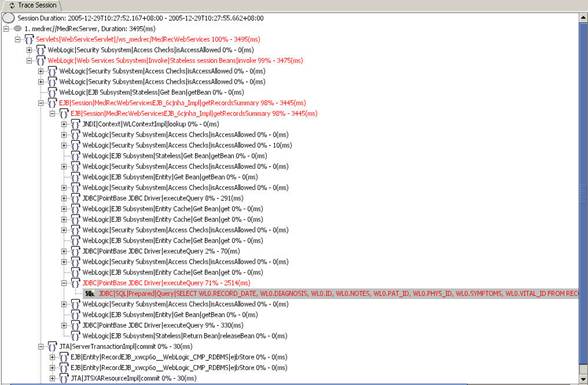 通過樹狀結(jié)構(gòu)可以看到事務內(nèi)部的調(diào)用情況并且快速的定位到某一有問題的操作,通過該技術(shù)可實時跟蹤生產(chǎn)系統(tǒng)中的某個具體事務問題,提供事務的執(zhí)行路徑和組件響應時間的詳細信息,如上圖。并能及時修正事務的性能問題。