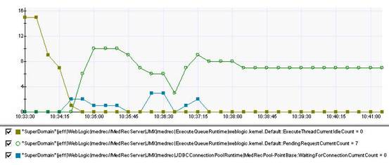 executethreadcurrentidlecount=0,pendingrequestcurrentcount開始有變化,對比10個并發(fā)用戶的線程使用情況,很明顯可以看出在20個并發(fā)的壓力下,系統(tǒng)的線程資源開始不足。