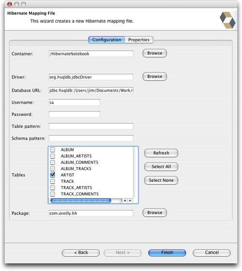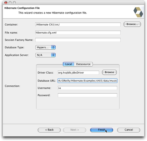 當向導啟動后,它所提供的用于放置文件的目錄取決于當前在eclipse中選中的文件。出于一致性方面的考慮,一定要把它和properties版本一起放在頂級的src目錄中。填入向導所需的其余信息,匹配配置的properties版本,如圖14所示。注意,與使用ant控制hibernate的執行(這是developer's notebook一書中所使用的方法)不同,當調用hibernate時,我們無法控制當前的工作目錄,所以需要在url中使用一條到數據庫文件的完全限定路徑。我使用的值是(有點難看):jdbc:hsqldb:/users/jim/documents/work/oreilly/hibernate/examples/ch03/data/music。(如果有人能告訴我如何讓eclipse或hibernate synchironizer對一個項目使用特定的工作目錄,我肯定會很感興趣。我在eclipse方面還是一個新手,所以如果知道這種情況是可能的,只是我不知道如何去做,我肯定不會感到吃驚。)
