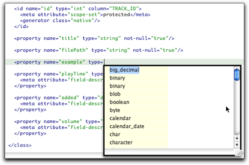 因為要適用于以hibernate映射文檔為中心的方法,hibernate synchronizer還包括一個用于eclipse的新編輯器組件,為此類文檔提供智能輔助和代碼自動完成功能。優秀的dtd驅動的xml編輯器(比如前面提到過的xmlbuddy)可以實現其中的一些功能,但是hibernate synchronizer利用對文檔語義的理解做得更好。它還提供了一個映射中的屬性和關系的圖形化視圖、創建新元素的“向導”界面,以及其他類似的優點。而且如前所述,在其默認配置中,編輯器會在用戶編輯映射文檔時自動重新生成數據訪問類。