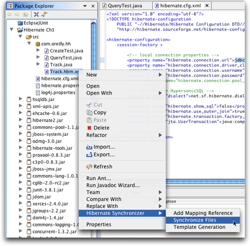 add mapping reference選項也很有用:它在主hibernate配置文件中添加了一項,告知有關該映射文檔的信息,所以無需在源代碼中加入任何內容來要求配置相應的映射。現在我們來看看選擇synchronize files的結果。