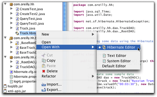 在我把track.hbm.xml重命名為track.hbm之后,它在package explorer中的圖標就更新為hibernate徽標,而默認的編輯器則變為插件的編輯器,如圖23所示。由于某種原因,其他的hibernate synchronizer選項(如圖17所示)對于其中任意一種擴展名都是可用的,但是編輯器只對較短的版本可用。