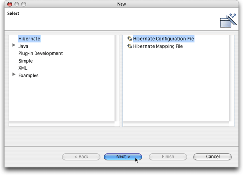 接下來要創建一個hibernate synchronizer可以使用的hibernate配置文件。src目錄中已經存在一個hibernate.properties文件,它說明了書中例子的配置,但是hibernate synchronizer只能使用hibernate的基于xml的配置方法。所以,我們需要把hibernate.properties文件的內容復制到一個新的hibernate.cfg.xml文件中去。從好的方面來說,這使我們可以見識hibernate synchronizer的一項特性,即配置文件向導。選擇file -> new -> other,單擊新可用的hibernate類別,選中hibernate configuration file,然后單擊next。