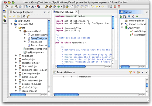 此處我的警告是多余的。eclipse清楚目錄的架構及用法,還找出了我曾下載和安裝過的所有第三方庫,以便讓hibernate和hsqldb數據庫引擎能夠運行。這種智能適應性是eclipse的重要特性之一。圖12顯示我們的新項目已經打開并準備好用于實驗了。它還顯示,eclipse不喜歡把窗口縮到足夠小以適應適當的屏幕快照。從現在起,我只能捕捉窗口的一部分。