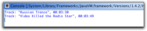 package com.oreilly.hh;import java.sql.time;import java.util.listiterator;import net.sf.hibernate.hibernateexception;import net.sf.hibernate.query;import net.sf.hibernate.session;import com.oreilly.hh.dao.trackdao;import com.oreilly.hh.dao._rootdao;/** * use hibernate synchronizer's daos to run a query */public class querytest3 {    public static void main(string[] args) throws hibernateexception {        // load the configuration file and get a session        _rootdao.initialize();        session session = _rootdao.createsession();        try {            // print the tracks that will fit in five minutes            query query = session.getnamedquery(                trackdao.query_com_oreilly_hh_tracks_no_longer_than);            query.settime("length", time.valueof("00:05:00"));            for (listiterator iter = query.list().listiterator() ;                 iter.hasnext() ; ) {                track atrack = (track)iter.next();                system.out.println("track: /"" + atrack.gettitle() +                                   "/", " + atrack.getplaytime());            }        } finally {            // no matter what, close the session            session.close();        }    }}trackdao提供的一個優秀特性是靜態常量,通過它,我們可以請求指定查詢,消除任何由于字符串輸入錯誤而引起運行時錯誤的可能性。我喜歡這一點!為這個測試類設置和執行run配置,將會生成預期的輸出,如圖22所示。