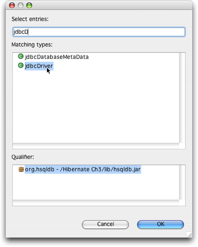 一種快速測試該配置是否生效的方式是使用其他的向導界面。選擇file -> new -> other,單擊新可用的hibernate類別,選中hibernate mapping file,然后單擊next。當向導出現時,它應該填充了剛才輸入的所有設置信息,可以單擊refresh按鈕來確定它可以與數據庫通信,它還會顯示找到了一個track表。第一次這樣做的時候,由于某種原因,您可能必須確認包含hsqldb驅動程序的.jar文件的位置,但是這種情況只會發生一次。不管怎樣,確認了一切正常之后,單擊cancel,而不是實際創建映射,因為我們想使用手動創建的已有映射文件。