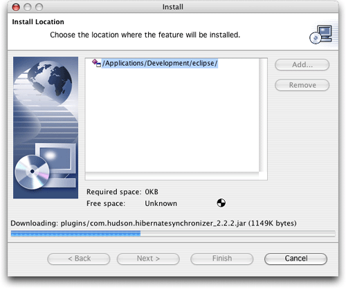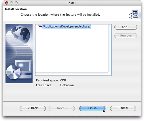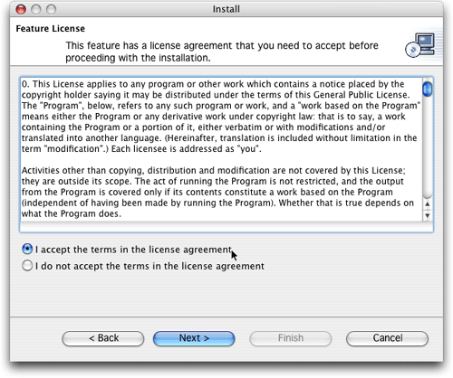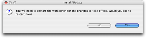 現在插件已經安裝完畢,需要退出并重新運行eclipse,以便使其生效。出現的對話框似乎暗示eclipse將自動重啟,但是根據我的經驗,單擊yes只會退出環境,必須手動重啟。這可能是eclipse 2.1的mac os x實現的一個局限性;eclipse 3將成為首個承諾對os x提供一流支持的版本。不管怎么說,這是一個小問題。如果需要重啟eclipse,現在就重啟吧,因為應該開始配置插件了!