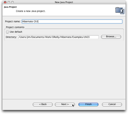 如果您準備創建一個新的eclipse項目,以便使用示例源代碼目錄中的一個,只需選擇file -> new -> project。選擇創建一個java項目,然后單擊next,為其命名(我使用的是“hibernate ch3”,如圖11所示),取消對use default復選框的選擇,以便可以告訴eclipse現有項目目錄的位置,然后單擊browse按鈕,定位它在驅動器上的具體位置。現在可以單擊finish,創建該項目,但是我一般喜歡單擊next,然后再次檢查eclipse的選擇。(當然,如果有什么出錯,您始終可以返回并修改項目屬性,但是我發現,如果存在庫丟失之類的錯誤,馬上就會面對大量的錯誤和警告,這實在是一件麻煩的事情。)