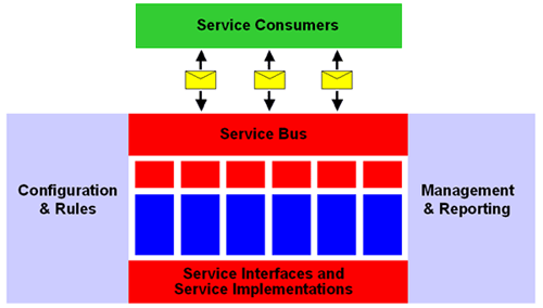 在圖2中, 服務消費者(service consumer)可以通過發送消息來調用服務。這些消息由一個服務總線(service bus)轉換后發送給適當的服務實現。這種服務架構可以提供一個業務規則引擎(business rules engine),該引擎容許業務規則被合并在一個服務里或多個服務里。這種架構也提供了一個服務管理基礎(service management infrastructure),用來管理服務,類似審核,列表(billing),日志等功能。此外,該架構給企業提供了靈活的業務流程,更好地處理控制請求(regulatory requirement),例如sarbanes oxley(sox),并且可以在不影響其他服務的情況下更改某項服務。