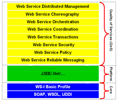 在企業中,關鍵任務系統(mission-critical system,譯注:關鍵任務系統是指如果一個系統的可靠性對于一個組織是至關重要的,那么該系統就是該企業的關鍵任務系統。比如,電話系統對于一個電話促銷企業來說就是關鍵任務系統,而文字處理系統就不那么關鍵了。)用來解決高級需求,例如安全性,可靠性,事物。當一個企業開始采用服務架構作為工具來進行開發和部署應用的時候,基本的web服務規范,像wsdl,soap,以及uddi就不能滿足這些高級需求。正如前面所提到的,這些需求也稱作服務品質(qos,quality of services)。與qos相關的眾多規范已經由一些標準化組織(standards bodies)提出,像w3c(world wide web consortium)和oasis(the organization for the advancement of structured information standards)。下面的部分將會討論一些qos服務和相關標準。
