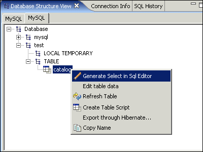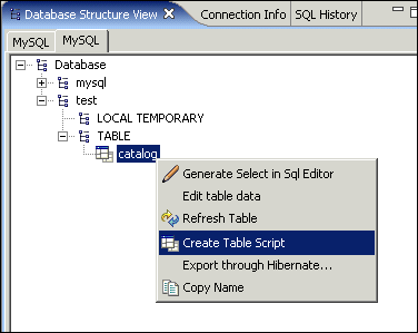 在 eclipse 的 sqlexplorer 視窗中選擇 database structure view 標簽。為了顯示表 catalog 的結構,在 database structure view 中選擇 database>test>table>catalog 結點。圖13顯示了表 catalog 的結構。