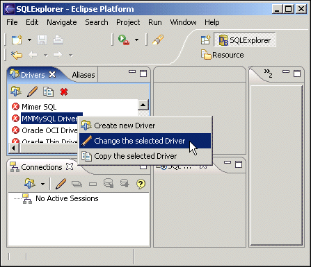 drivers 標簽顯示了不同的數據庫驅動,它們被用來連接不同的數據庫。現在可用的數據庫包括db2, mysql, oracle, sybase, hsqldb, sqlserver 和 postgresql。針對mysql,我們需要配置sqlexplorer。為了配置mysql驅動,右擊 mmmysql driver 結點, 并且選擇 change the selected driver, 如圖4所示。