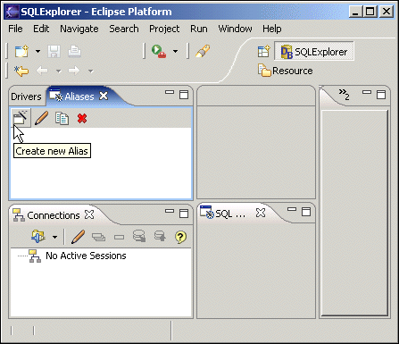 想要連接到 mysql 數據庫并提取其中的表格,我們需要為連接建立一個別名。一個連接的別名說明了連接設置,jdbc 驅動,url,用戶名和密碼。在sqlexplorer視窗中選擇 aliases 標簽。單擊 “create new alias” 按扭來創建一個新的別名,如圖7所示。
