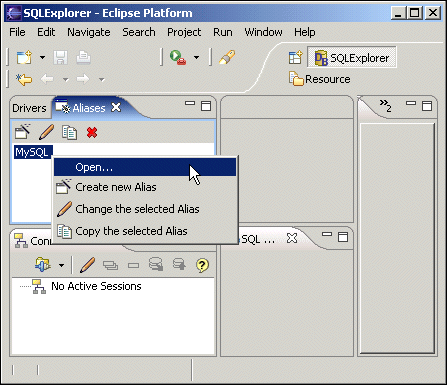 mysql 別名用來連接到 mysql 數據庫并且從中提取數據。要想打開數據庫連接,右擊 mysql 別名結點并選擇 open,如圖10所示。