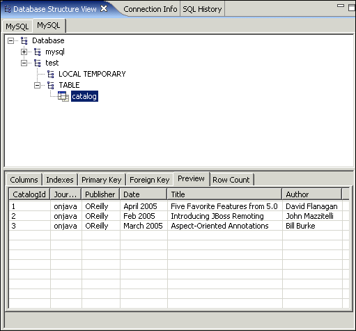 為了顯示選中的表格中的數據,請選擇 preview 標簽。圖14顯示了表 catalog 中的數據。關于表格的其他的信息分別在 indexes, primary key, foreign key 和 row count 標簽中顯示。