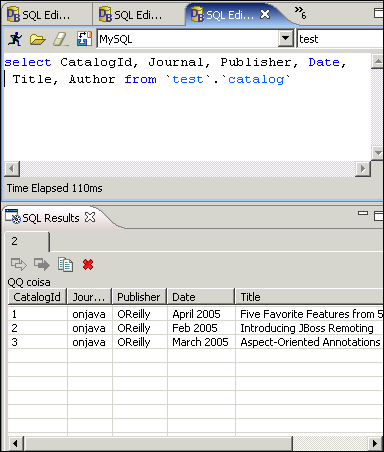 在上一節中我們在 eclipse 中配置了 sqlexplorer 插件。下面,我們將從示例表 catalog 中提取并修改數據。如果是從一個命令行 sql 客戶端訪問數據庫,則使用如下命令來提取數據(在一行中):