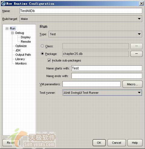 在name中填入testalldb。在type中選擇test,對話框下部的窗口調(diào)整為測試運行配置的界面。默認class單選框選中,允許你指定一個測試用例類,由于我們希望通過該配置項運行chapter25.db包下所有的測試用例,所以我們選擇package單選框,并通過其后的…按鈕選擇chapter25.db包。