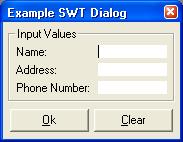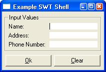 import org.eclipse.swt.widget.*; import org.eclipse.swt.layouts.*;  : composite composite = ...; filllayout filllayout = new filllayout(swt.vertical); composite.setlayout(filllayout);  import org.eclipse.swt.widget.*; import org.eclipse.swt.layouts.*;  : composite composite = ...; gridlayout gridlayout = new gridlayout(2, false); composite.setlayout(gridlayout); label l1 = new label(composite, swt.left); l1.settext("first name: "); text first = new text(composite, swt.single); label l1 = new label(composite, swt.left); l2.settext("last name: "); text last = new text(composite, swt.single); first.setlayoutdata(new griddata(swt.fill, swt.fill, true, true)); last.setlayoutdata(new griddata(swt.fill, swt.fill, true, true));  import org.eclipse.swt.widget.*;  : display display = new display(); shell shell = new shell(display); shell.settext("shell title"); // *** construct shell children here *** shell.open();       // open shell for user access // process all user input events while(!shell.isdisposed()) {    // process the next event, wait when none available    if(!display.readanddispatch()) {        display.sleep();    } } display.dispose();  // must always clean up