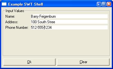 import org.eclipse.swt.widget.*;  : composite parent = ...;  : // create a center aligned label label label = new label(parent, swt.center);   label.settext("this is the label text");  import com.eclipse.swt.graphics.*; import org.eclipse.swt.widget.*; import org.eclipse.swt.custom.*;  : composite parent = ...; image image = ...;  : // create a left aligned label with an icon clabel clabel = new clabel(parent, swt.left);   label.settext("this is the imaged label text""); label.setimage(image);  import org.eclipse.swt.widget.*;  : composite parent = ...;  : // create a text field text name = new text(parent, swt.single);   name.settext("<none>"); name.settextlimit(50); name.settooltiptext("enter your name -- last, first");  name.selectall();  // enable fast erase   清單 4 創建了一個“clear”按鈕: