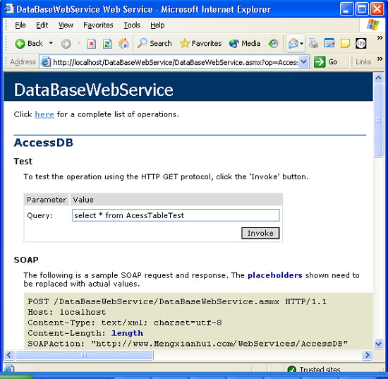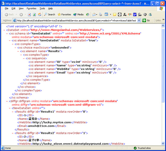 選擇accessdb(注意:在進行此操作之前,請先建立數據庫accesswebservices.mdb,并建立表acesstabletest,并放到databasewebservice目錄之下),在query里輸入“select * from acesstabletest”,然后點“invoke”,你就會得到一個xml格式的查詢結果,顯示如下: