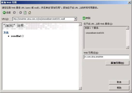 ![]() 圖05:在【短信】項(xiàng)目中添加web引用的界面 |