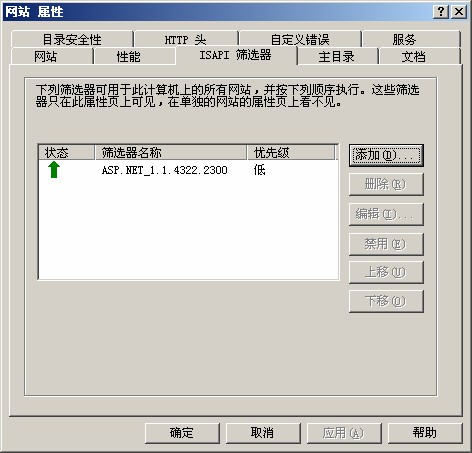 但是iis本身是不支持動態(tài)頁面的,也就是說它僅僅支持靜態(tài)html頁面的內(nèi)容,對于如.asp,.aspx,.cgi,.php等,iis并不會處理這些標(biāo)記,它就會把它當(dāng)作文本,絲毫不做處理發(fā)送到客戶端。為了解決這個問題。iis有一種機制,叫做isapi的篩選器,這個東西是一個標(biāo)準(zhǔn)組件(com組件),當(dāng)在在訪問iis所不能處理的文件時,如asp.net 1.1 中的iis附加isapi篩選器如圖: