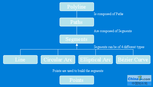 polylines是有序path組成的集合,可以擁有m、z和id屬性值。polyline對象的ipointcollection接口包含了所有節點的復制,igeometrycollection接口可以獲取polyline的paths,isegmentcollection接口可以獲取 polyline的segments。