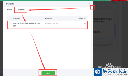 7、將光標定位在在這條素材管理的編輯框內的合適地點(投票的地點),點擊編輯框的投票按鈕,彈出如圖所示界面,選擇已經設置好的投票,點擊確定并保存此圖文資源。