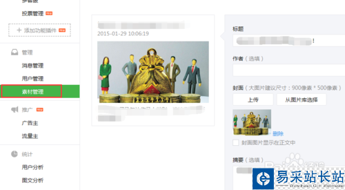 6、找到一篇恰當的圖文信息,將此投票到圖文素材中:素材管理—>打開一條素材。