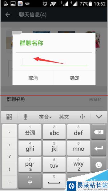 4、點擊進入以后,可以看見有個讓你輸入群聊名稱的對話框,輸入你想要命名的文字,如圖所示。