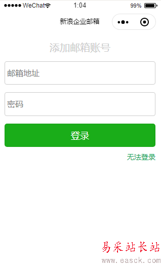 <!--index.wxml--><view class="container"><text class="indexTitle">添加郵箱賬號</text><view class="indexInput"> <input maxlength="10" placeholder="郵箱地址" /></view><view class="indexInput"> <input maxlength="10" placeholder="密碼" /></view><view class="indexButton"><button type="primary"> 登錄 </button></view><view class="indexNologin"><a href=""> 無法登錄 </a></view></view>