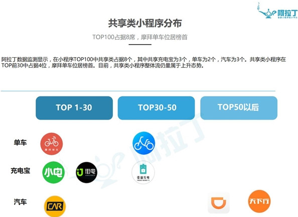 值得一提的是,TOP100中,共享類小程序占8個(gè),其中4款擠入TOP30,共享類小程序整體流量仍屬于上升態(tài)勢(shì)。