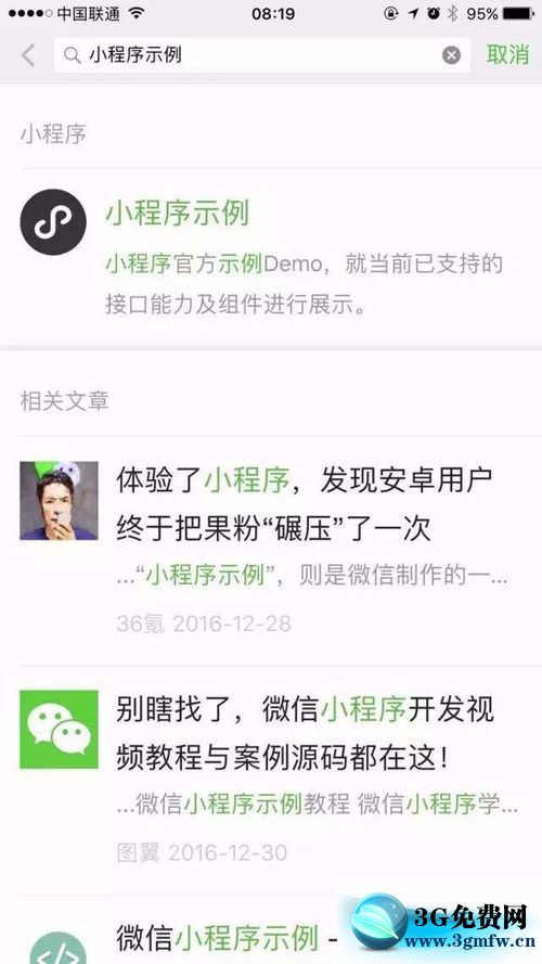 然后搜索。點(diǎn)最下面的:搜一搜 小程序示例 朋友圈、公眾號(hào)、文章等。然后搜索。點(diǎn)最下面的:搜一搜 小程序示例 朋友圈、公眾號(hào)、文章等。