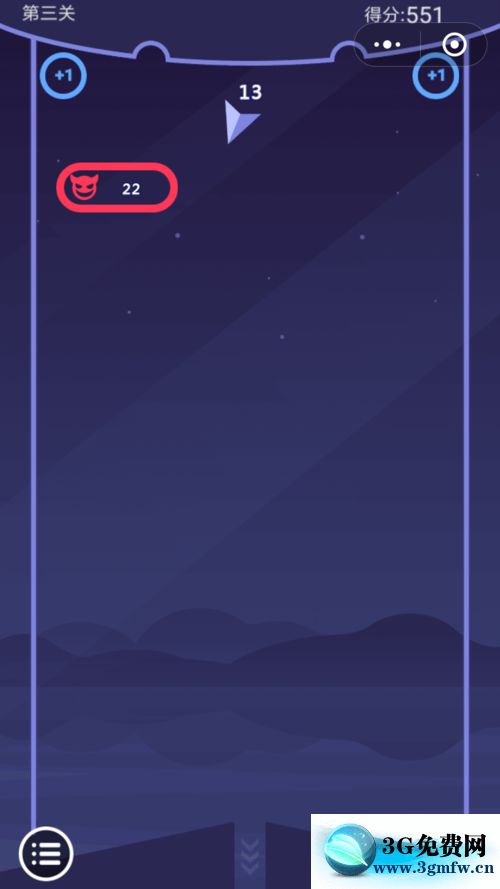 第三關(guān),給我的感覺就是難。因?yàn)閎oss的設(shè)定是來回移動的,所以不能直接進(jìn)行射擊,只能靠和上邊的障礙物和兩邊的邊緣進(jìn)行來回的彈射來進(jìn)行運(yùn)氣性撞擊。