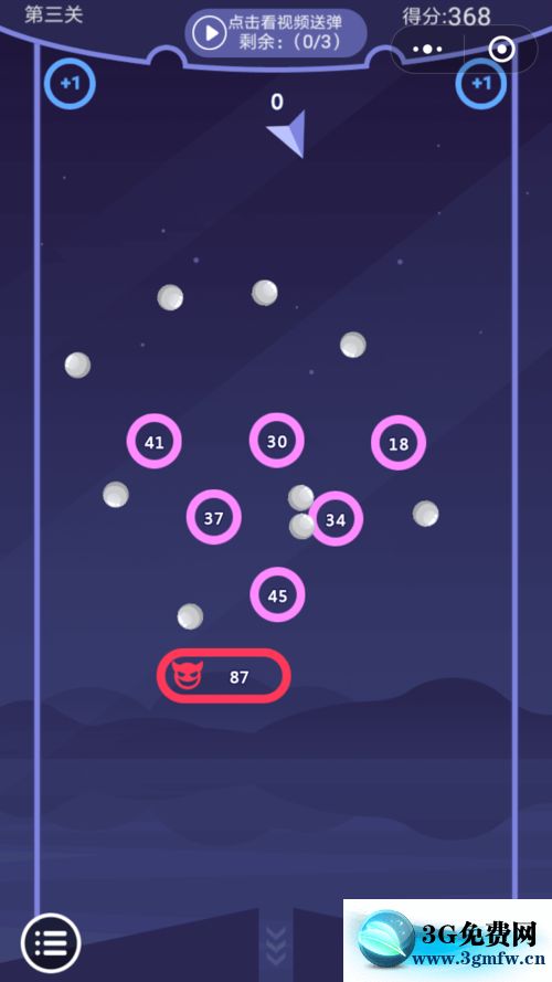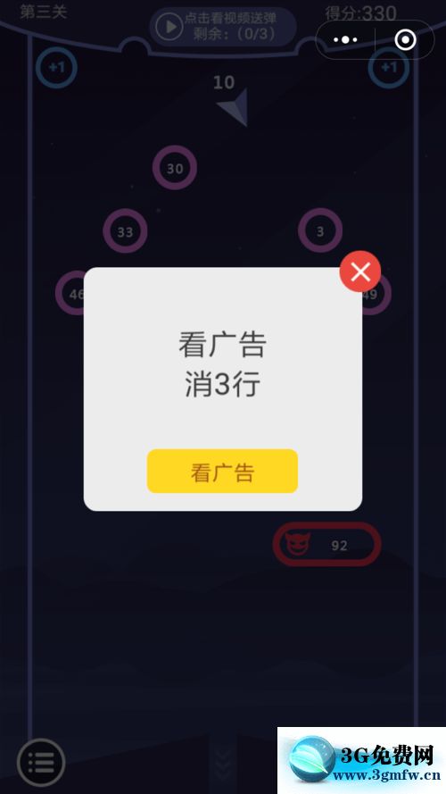 然后點(diǎn)擊上方的三個小視頻廣告,看完后會增加三個球,這樣開局射擊才能有一定的優(yōu)勢。