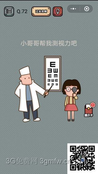 第71關 :問題: 打開保險箱答案:那一直鹿角放到鎖上面第72關 :問題: 小哥哥幫我測視力吧答案:將小女孩的眼鏡拿掉,測視力不能帶眼鏡第73關 :問題: 聰明的烏鴉怎么才能喝到水答案:將烏鴉移到一灘水那里第74關 :問題: 小明買了多少瓶牛奶答案:11(將面前四瓶移開后面還有兩瓶)第75關 :問題: 哪本書更厚答案:在書上滑動,數就會側著,就可以看到書的厚度了