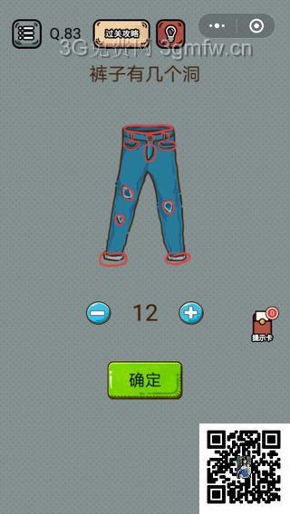 第81關 :問題: 點擊最小的東西答案:鉆石第82關 :問題: 哪本書最薄答案:手指在書右下角往上滑動,書角就會翹起來,很清楚的看清書本的厚度第83關 :問題: 褲子有幾個洞答案:12(答案如圖)第84關 :問題: 上帝之手幫助你到達終點答案:用手直接將車拿到終點即可第85關 :問題: 桌上有幾本書答案:0