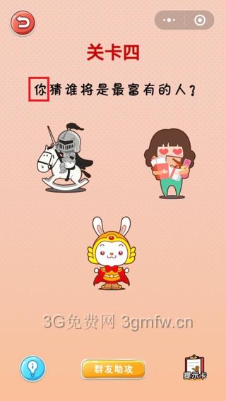 關(guān)卡一:下圖中哪一種顏色最多答案:白色關(guān)卡二:下圖中哪個(gè)不能吃答案:盤子關(guān)卡三:點(diǎn)擊游得最慢的答案:點(diǎn)擊題目中的魚關(guān)卡四:你猜誰將是最富有的人答案:點(diǎn)擊題目中的“你”字關(guān)卡五:找到圓形。答案:點(diǎn)擊題目中的句號(hào)