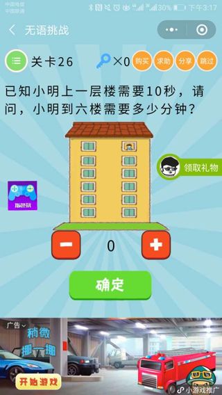 第26關(guān)問題:已知小明上一層樓需要10秒請(qǐng)問小明到六樓需要多少分鐘