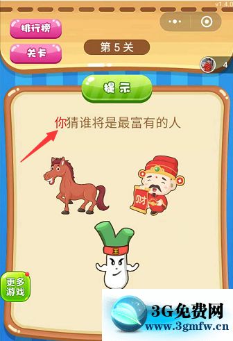 第一關,下面哪一種顏色最多?答案是白色,因為外圍一圈全部是白色第二關,下面哪個不能吃?點擊蛋糕下面的盤子,盤子不能吃第三關,點擊游得最慢的小黃鴨點擊標題中的小黃鴨,因為不會動第四關,找到圓形。點擊標題中的句號即可通關第五關,你猜誰將是最富有的人?點擊標題中的你字即可通關