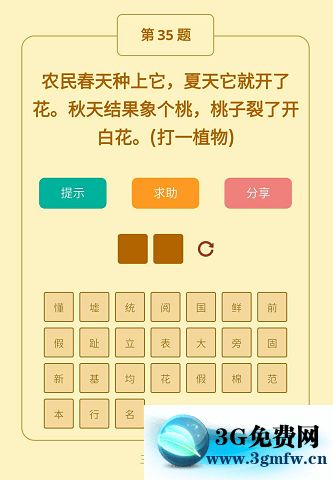 第三十五關,農民春天種上它,夏天它就開了花。秋天結果像個桃,桃子裂了開白花。(打一植物)