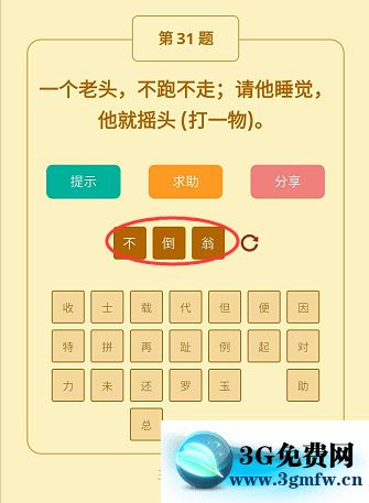 第三十一關,一個老頭,不跑不走;請他睡覺,他就搖頭(打一物)