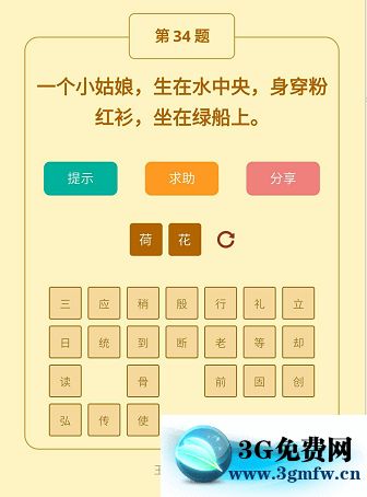 第三十四關,一個小姑娘,生在水中央,身穿粉紅衫,坐在綠船上。