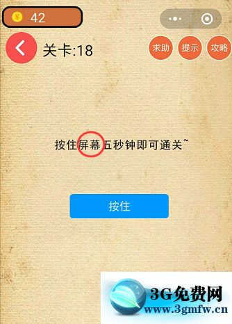 按住屏幕五秒鐘即可通關(guān)是微信小程序《最強(qiáng)燒腦游戲腦力吃雞大作戰(zhàn)》游戲第18關(guān)的問題,很多玩家還知道答案是什么,下面小編為大家?guī)砦⑿抛顝?qiáng)燒腦游戲腦力吃雞大作戰(zhàn)第18關(guān)攻略。問題:按住屏幕五秒鐘即可通關(guān)。
