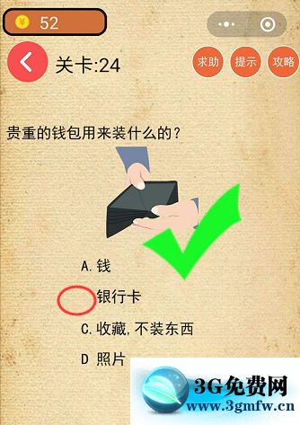 貴重的錢包用來裝什么的是微信小程序《最強燒腦游戲腦力吃雞大作戰》游戲第24關的問題,很多玩家還知道答案是什么,下面小編為大家帶來微信最強燒腦游戲腦力吃雞大作戰第24關攻略。問題:貴重的錢包用來裝什么的。