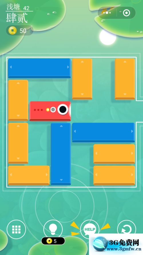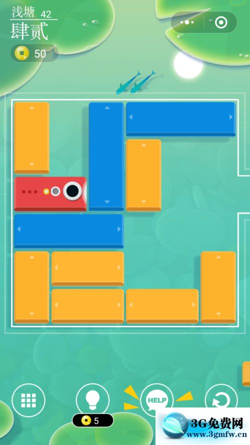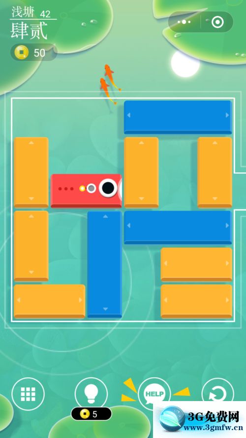 微信小游戲“淺塘”第42關開始如下圖所示,顯然只能移動最右邊的豎黃色塊向下,然后將最上邊的橫長藍色塊向有移動,紅魚塊前邊的豎長藍色塊上移,再將下面的橫長藍色塊左移,最右邊的豎黃色塊向下移。